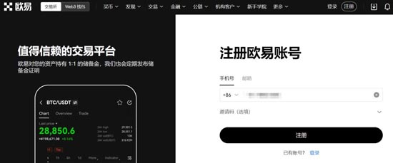 1、打开欧易官网(),在首页点击注册进入注册页面