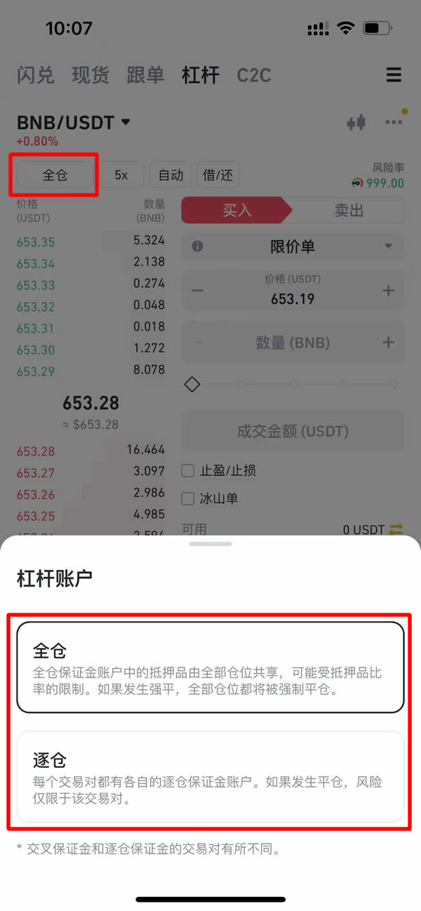 币安杠杆保证金模式分为全仓/逐仓两种,主要差别为使用保证金的方式,以下将分别解释。