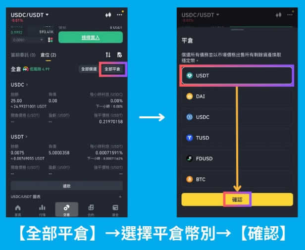点击【全部平仓】→选择平仓后要转换的币别→【确认】即完成币安杠杆平仓