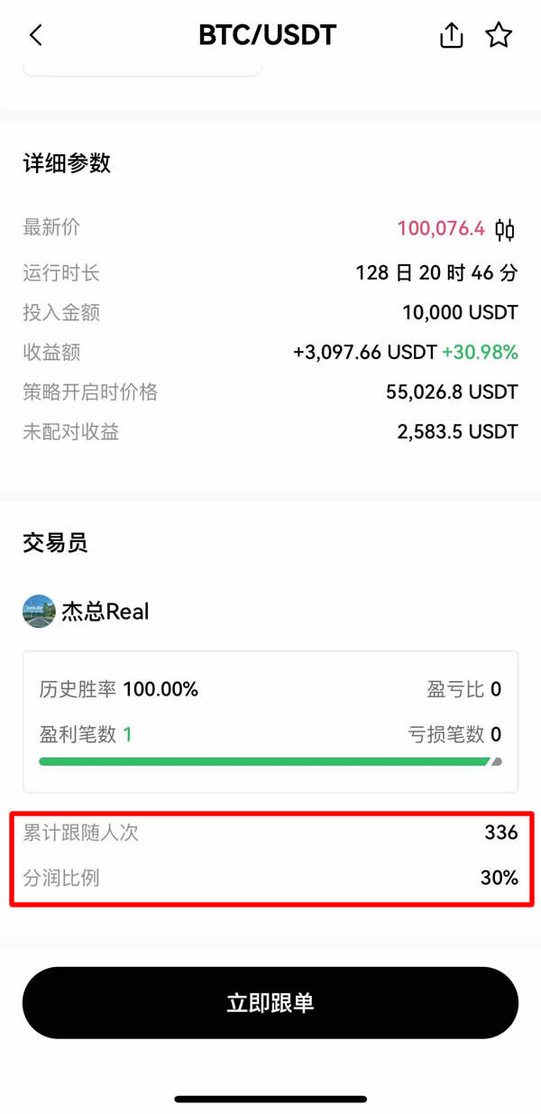 小提醒:有些带单者会设置分润机制,也就是你跟单他们的网格策略赚到钱,要分一些收益给他们,一般都是设置30% 分润。