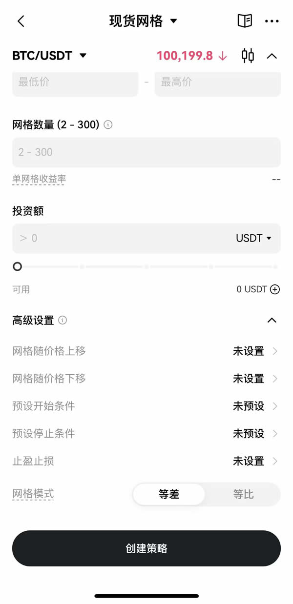 价格区间(USDT):设置你想要交易的价格范围,超出范围就会自动停止网格交易。