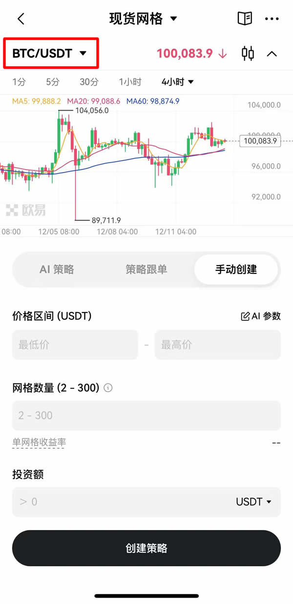 最后,选择要使用AI 策略、策略跟单、手动创建哪一种网格模式。