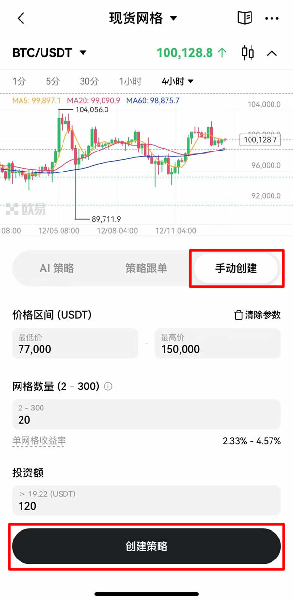 打开OKX App ,找到「现货网格」选择要执行现货网格的币种设置网格参数,点击「创建策略」