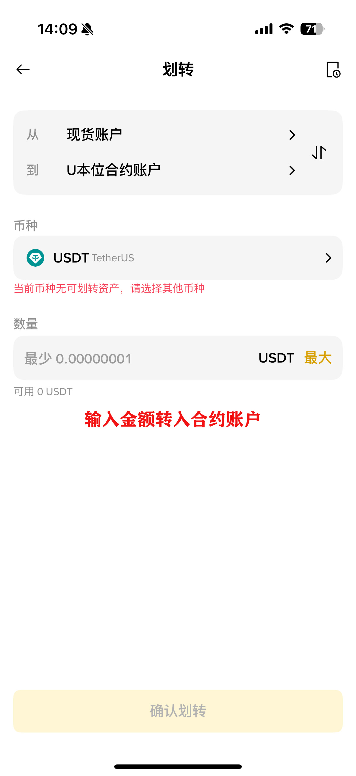由于需要先存入保证金才能使用合约,所以需要先将资金划转到U 本位合约帐户中。