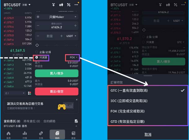 币安合约的成交时效与股票交易概念相同,分为GTC / IOC / FOK / GTD。