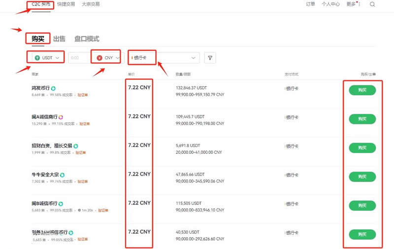 9、进行交易前需要拥有USDT,可在C2C买币进行交易,根据需求选择合适商家,点击“购买”,而后根据提示进行付款、等待商家放币(若是长时间没有收到币种,可联系客服进行处理)