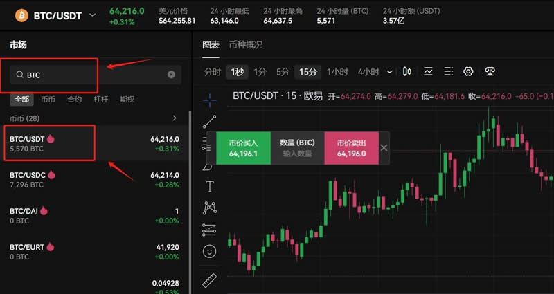 11、在搜索框输入想要购买的币种,例如BTC,选择BTC/USDT交易对,可以看到BTC实时行情