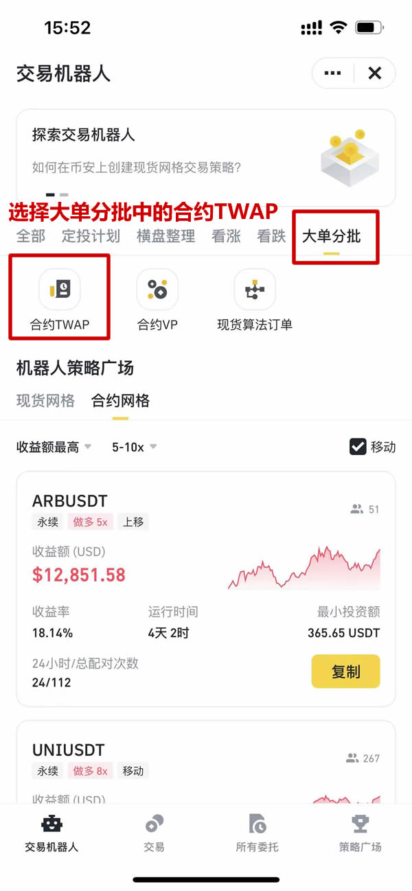 当你进入交易机器人页面之后,接着选择其中的「大单分批」。