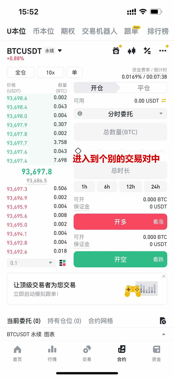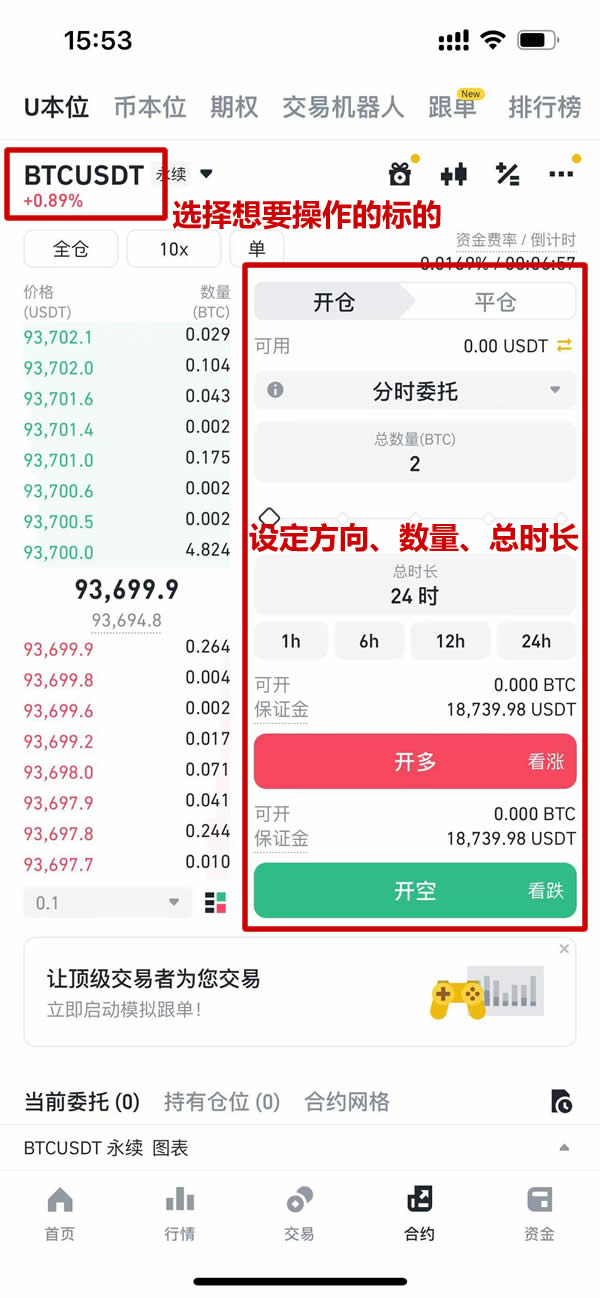 登入币安App()点选「合约」中的「机器人」点选「大单分批」中的「合约TWAP」选择标的并设置交易参数确认并执行下单