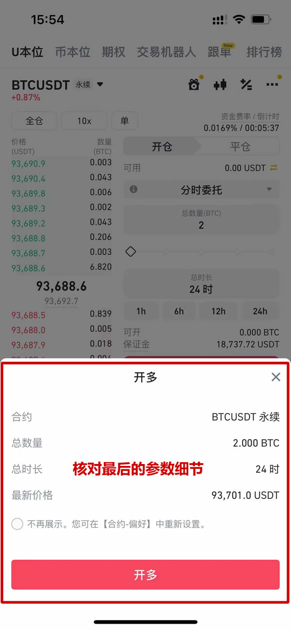 交易方向:选择「买入」(做多)或「卖出」(做空)总量:输入你想要交易的总数量执行时间:设置你希望整个订单在多长时间内完成,例如1 小时、4 小时或者自定义时间(最多24 小时)