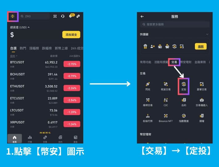 以下币安定投教学,是自行设定投资组合的操作步骤,示范是以定投BTC、ETH为主。