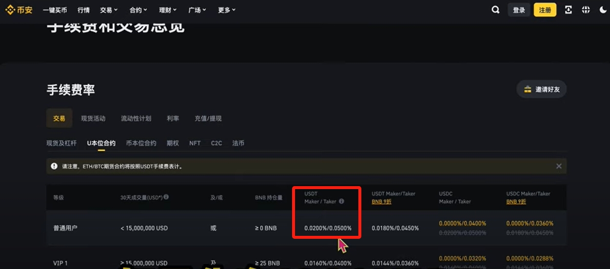 合约的话,如果你是普通用户,也就是30天内交易量不超过150万美元,或者是持有BNB不超过25颗的用户。无论你是买方还是卖方,你的U本位合约挂单手续费都是0.02%,吃单手续费都是0.05%。目前币安的手续费用都是直接从操作金额中扣除的。