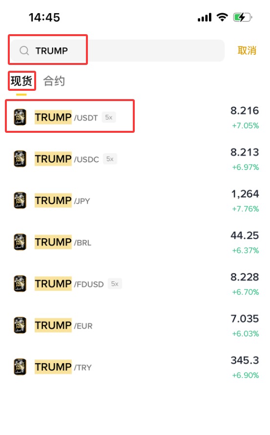 3、输入【TRUMP】,这时下拉会显示【现货】【TRUMP/ USDT】,点击【TRUMP/ USDT】。(作为新手,不建议做合约,所以这里就不演示合约购买方式了。)