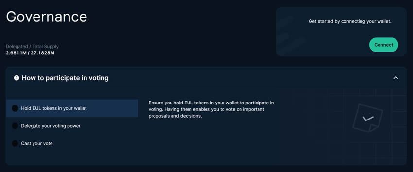 EUL持有者可以参与质押计量器,以决定特定市场的未来发行量,从而提供动态的分配模型。在WETH、USDC和USDT市场中质押eTokens可以让用户赚取EUL,但质押的代币不能作为贷款的抵押物。治理决策,如是否继续发放质押奖励,通过DAO投票决定。