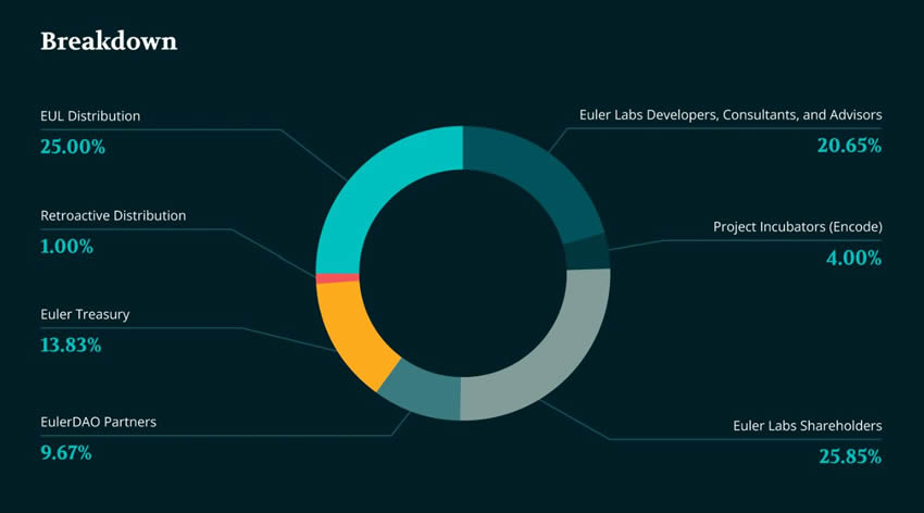 EUL的总供应量在前四年内固定为27,182,818个代币。此后,代币持有者可以投票决定引入每年最高2.718%的通货膨胀率,新代币将进入财政库。初始供应量的一个重要部分分配给了用户(25%)、Euler Labs股东(25.85%)、合作伙伴(9.67%)和团队成员(20.65%),其余的代币则预留给财政库、Encode孵化器和社区项目。