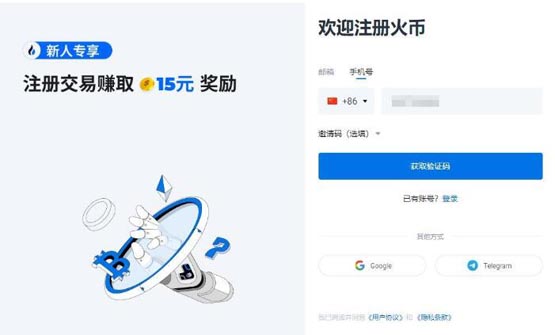 1.进入火必官网(点击注册),选择【手机号】注册,输入手机号,点击【获取验证码】。