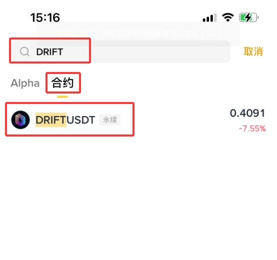 3、输入【DRIFT】,这时下拉会显示合约DRIFT USDT,点击【DRIFTUSDT】。