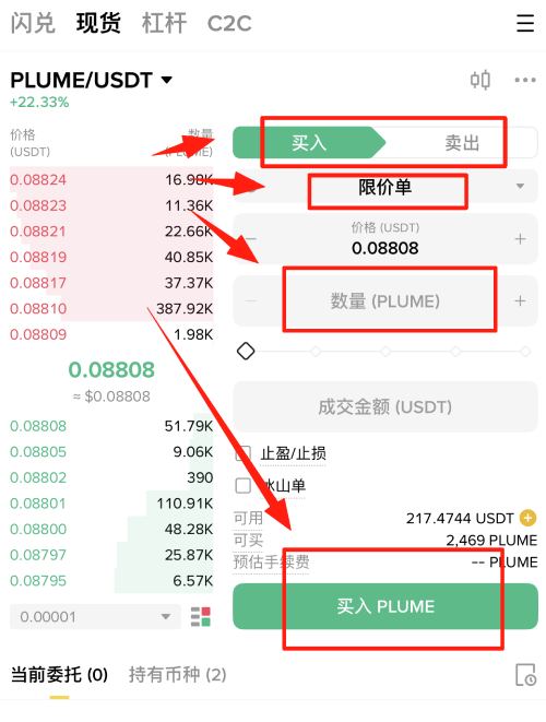 2、点击买入,依次选择【限价单】-购买【价格】-购买【数量】-【成交数量】,设置好之后,点击【买入PLUME】。