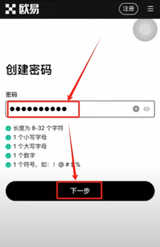 创建密码,输入账户密码,点击【下一步】。到这里我们的注册环节已经完成了。