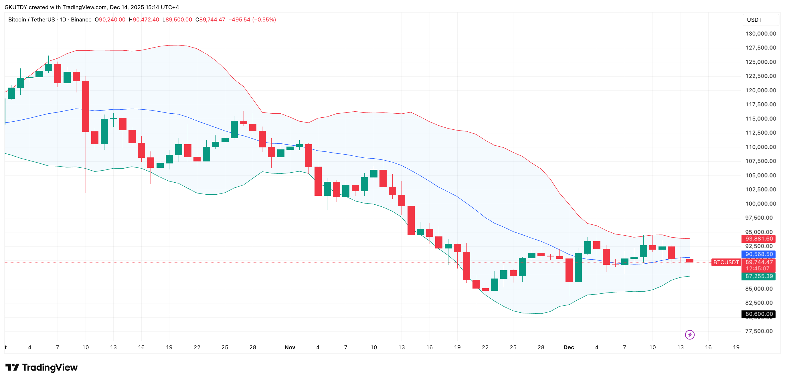 只要日线收盘持续低于中轨,价格将自然向下轨靠拢——该位置目前位于87,250美元,较现价仍有近3%下行空间。