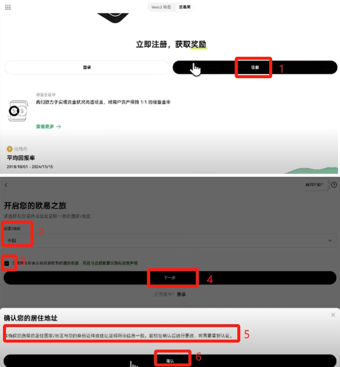 点击【注册】,选择居住的国家/地区,你有哪里的证件,就选择哪个国家,我们选“中国”,勾选同意,点击【下一步】。这里提示要以你的身份件件为准,点击【确认】。