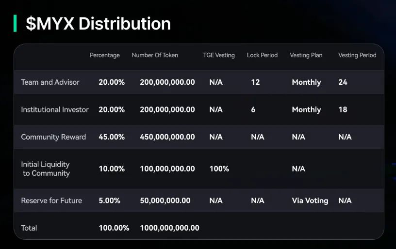 社区奖励(45%)--450,000,000 MYX:致力于通过质押奖励、早期采用者空投、BMYX 代币持有者的独家空投以及长期激励计划来回报社区。