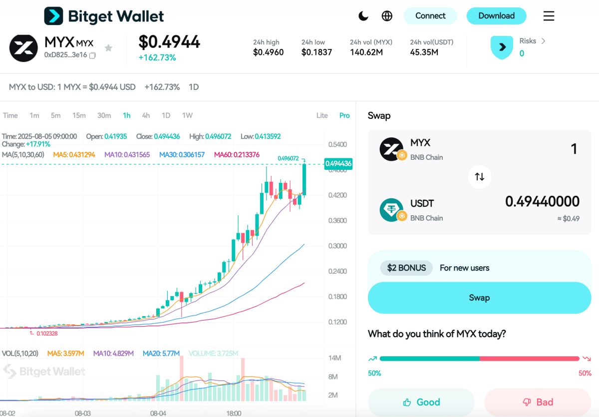 投资者情绪:2025年8月初,MYX单日飙升逾130%,表明投机兴趣浓厚。持续的积极情绪可能推动价格上涨,而突然的抛售则可能引发大幅回调。