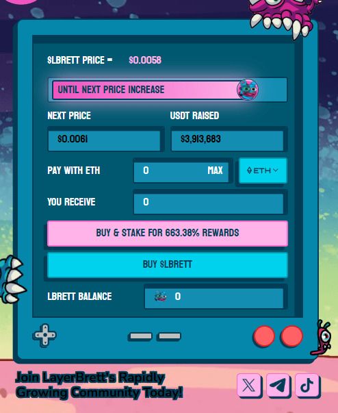 其预售价格为 0.0058 美元,质押奖励年化收益率高达 633%,早期投资者看到了巨大的增长潜力。如果团队能够兑现承诺的功能,例如 NFT 集成、游戏合作伙伴关系以及 Base 内部更深层次的实用性,$LBRETT 代币或许能够从纯粹的 meme 转变为实用资产。