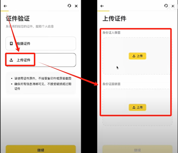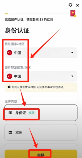 选择你的居住国家和证件签发国家,证件类型身份件、驾照、护照都可以。这里就选择身份件,点击【继续】。