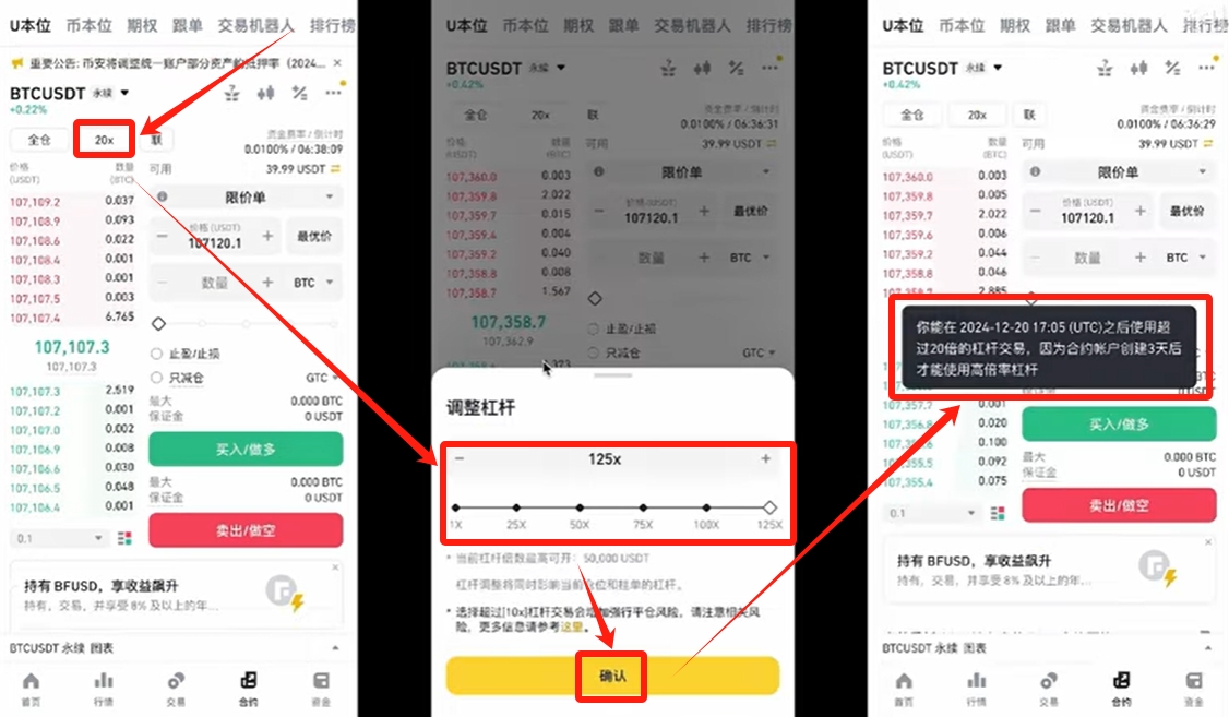 开通成功后,我们点击一下杠杆倍数这里,币安的合约杠杆最大可以开到125倍。但是当你点击确认的时候,会发现提交不了。它会提示新创建的合约账户,要等3太难之后才能使用高倍杠杆。所以想做高倍合约的话,尽早把账户开起来总是没错的。