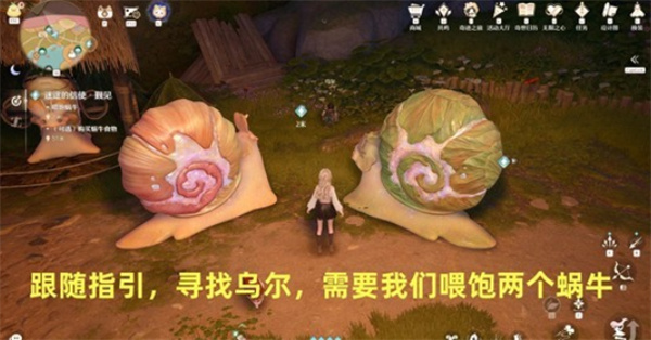 喂食按钮可能不立即出现,可移动角色或靠近蜗牛头部触发。