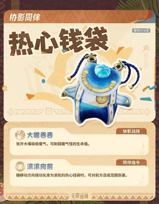随移动方向推动化身为滚轮的热心钱袋时,可对前方造成范围伤害。
