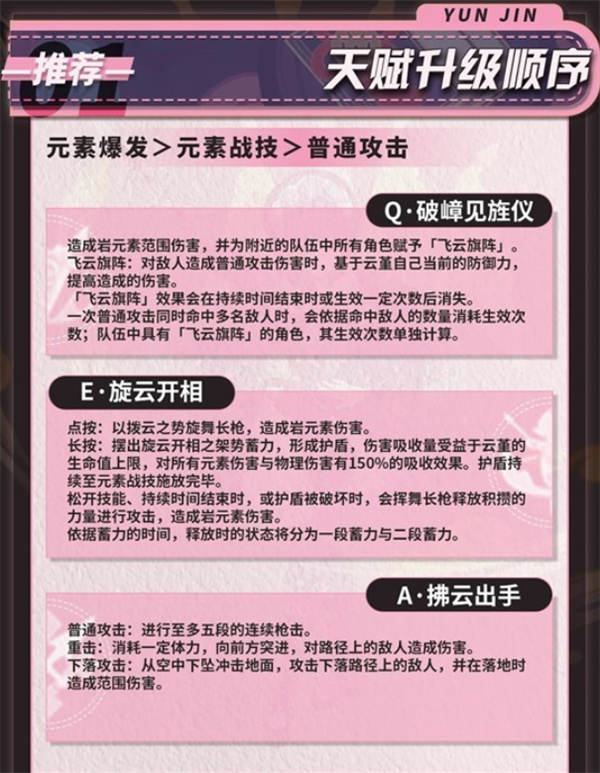云堇的核心作用来自 元素爆发「飞云旗阵」,为全队普通攻击提供大量伤害提升,因此必须优先拉满。