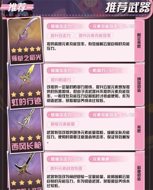 提供高额充能与伤害加成,非常契合高频释放爆发的辅助云堇。