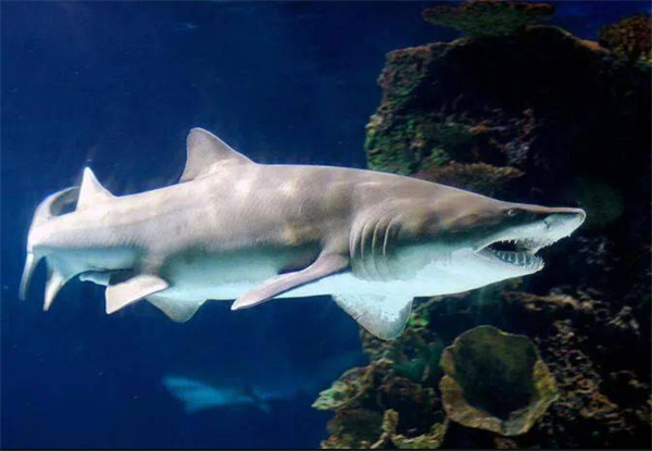沙虎鲨之所以被称为“锥齿鲨”,主要是因为它们的牙齿细长尖锐,形状就像锥子一样,向外突出,非常适合用来捕捉并牢牢钩住猎物。这种独特的“锥形牙”让沙虎鲨看上去牙齿密集且外露,具有极强的威慑感。锥齿结构不仅能轻松刺穿鱼类、乌贼等猎物的表皮,也方便在捕食时减少逃脱的可能性,是其重要的生存优势之一。