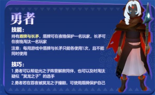 支援队友:勇者可用盾牌保护光之子阵营的同伴,确保他们在夜晚不被淘汰