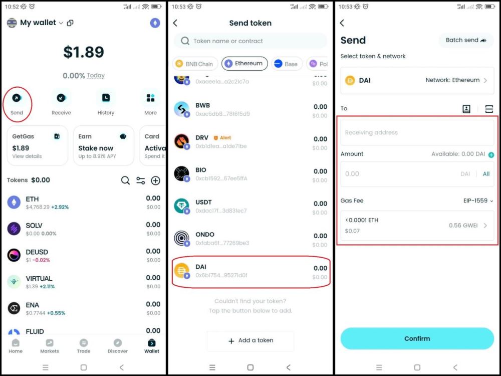 要将 DAI 发送到另一个钱袋,请前往提款,输入地址并确认。