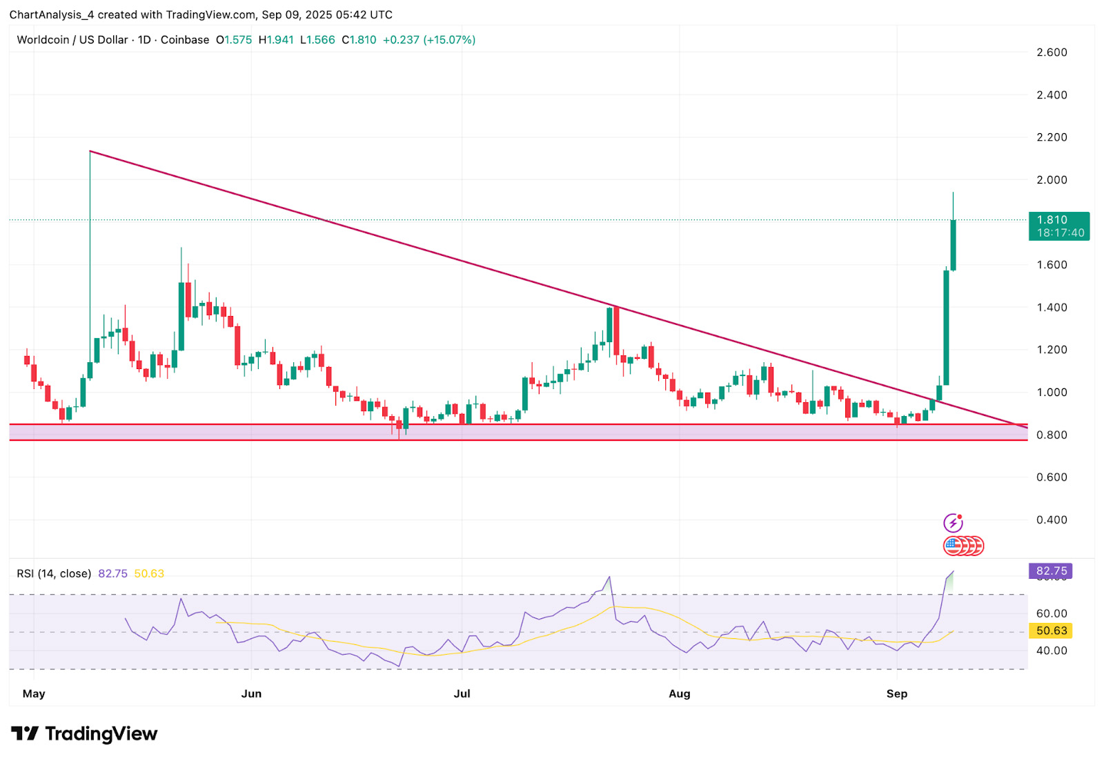 Worldcoin (WLD) 突破下行阻力位趋势线后,暴涨至八个月高点 1.81 美元。在 Eightco 2.5 亿美元国库资金配置以及全球采用计划不断推进的支持下,该代币已在山寨币市场中掀起最强劲的反弹之一。现在的问题是,WLD 能否维持这一势头,并在 2020 年实现 10 美元以上的长期估值。