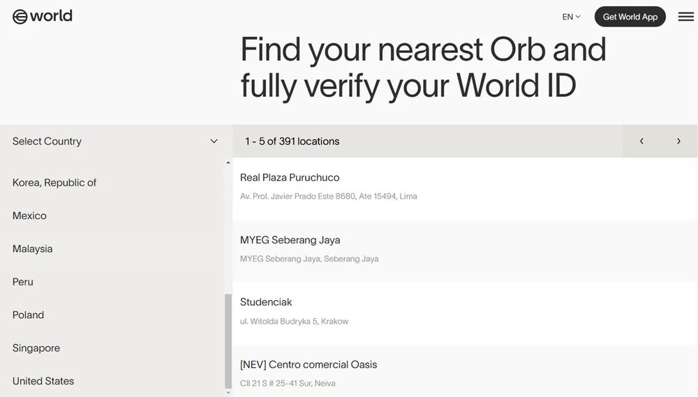 Worldcoin 在 17 个国家设有 391 个 Orb 扫描点,用户可在此验证身份并接收 WLD 代币。主要地点包括美国、德国、日本和阿根廷的城市,随着项目的扩展,还计划设立更多地点。