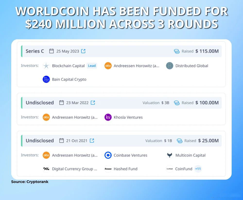 Worldcoin 已在三轮融资中从 27 位投资者处筹集了2.4 亿美元,其中包括风险投资公司 Andreessen Horowitz 和 Blockchain Capital,以及 Reid Hoffman 等投资者。