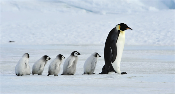 帝企鹅生活在极寒的南极,为了防止企鹅蛋被冰雪冻裂,雄企鹅会把蛋放在脚背上,用腹部的育儿袋覆盖保温。在长达两个多月的孵化期里,雄企鹅几乎不进食,顶着严寒和风雪一动不动地守护企鹅蛋。这种独特的孵化方式展现了帝企鹅极强的耐力与亲职本能,是动物界中最感人的育雏行为之一。