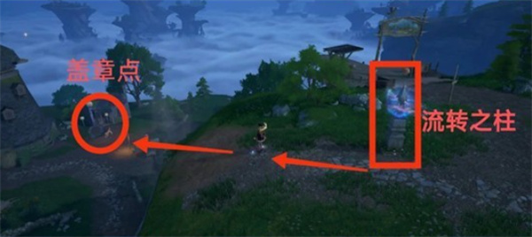 传送至麦浪农场后向后转,沿右下方平台漂浮前进,经过气流柱即可到达盖章点位置,位于石屋前方。