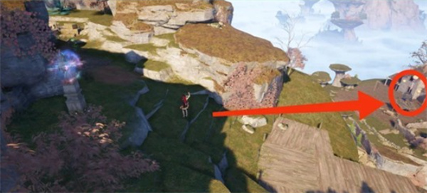 传送后朝右后方观察,下方一层的矮石树上可见盖章点。