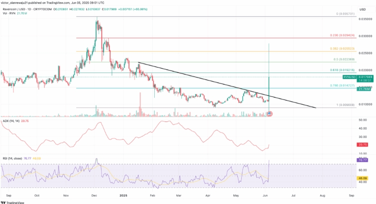 韩国最大交易所Upbit 于2025 年6 月5 日下午5 点(当地时间)上线Ravencoin(RVN)韩元交易对。 RVN 币的上市引发了散户投资者的强烈兴趣,其中韩国交易员尤为突出,他们通常在新的韩元交易对上线后不久就蜂拥入市。这股早期势头推动Ravencoin 股价全天大幅上涨。