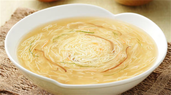 “横劈竖切万丝绦,皆赞淮扬刀工好”说的就是文思豆腐。文思豆腐是淮扬菜中的传统名肴,以其极致的刀工闻名。制作时,厨师将一块豆腐切成如发丝般细的条状,放入汤中后根根分明、柔若游丝。此菜不仅考验刀工精度,更讲究汤清味鲜,入口滑嫩。相传由扬州名厨文思首创,因而得名,体现了淮扬菜细腻精致的烹饪艺术。