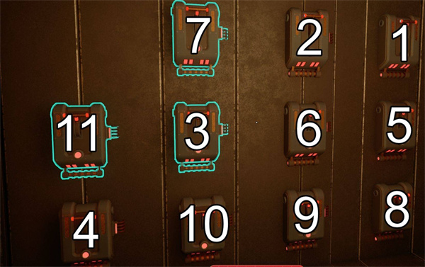 该谜题共有三排11个开关,上锁的门上设有三个指示灯。