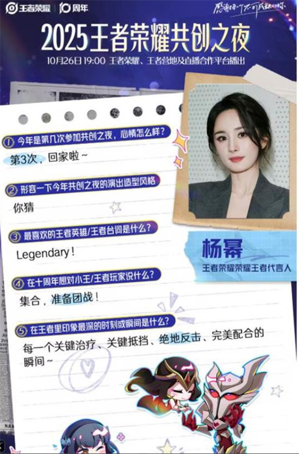 10月26日20:00,【王者荣耀2025共创之夜】将正式开幕。无论你是老玩家还是新召唤师,都能在这场盛典中找到属于自己的回忆与感动。让我们一同迎接王者荣耀的下一个十年,共赴这场特别的十年之约。