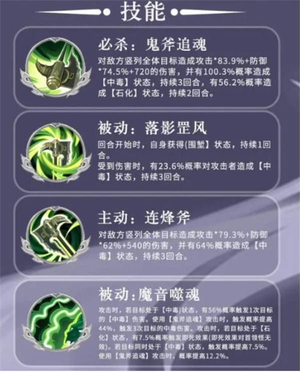 特点:兼具高生存与控制输出,拥有概率“即死”机制与石化控制效果。