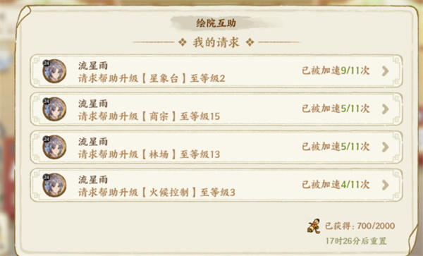 7级后加入一个活跃绘院,通过求助功能能显著缩短建筑升级时间,加速整体发展。