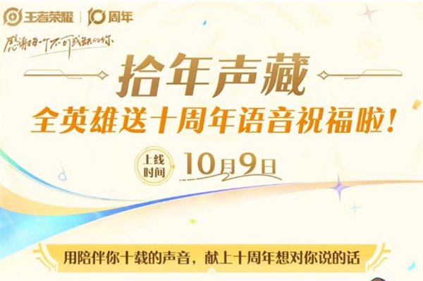 为庆祝《王者荣耀》十周年,官方推出特别活动“拾年声藏”,让玩家以最具纪念意义的方式重温英雄的经典声音。本次活动于今日正式开启,全英雄语音祝福限时解锁,老玩家们可借此聆听熟悉的声音,共同回顾十年征程。